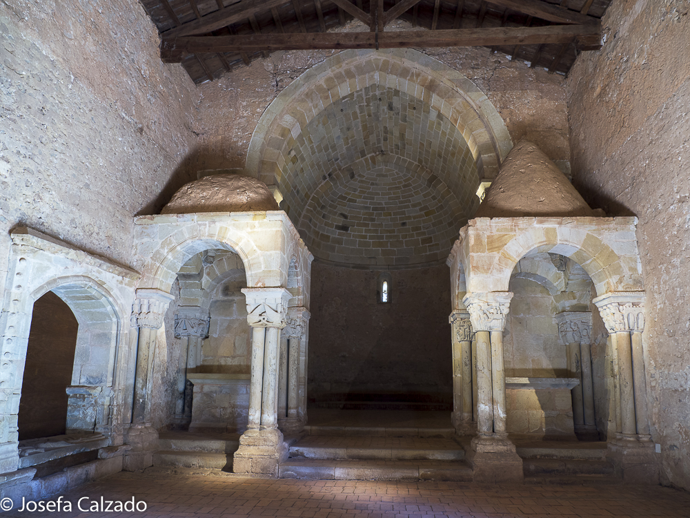Interior de una sola nave y ábside semicircular, destacando los dos templetes adosados al muro en el comienzo de la cabecera