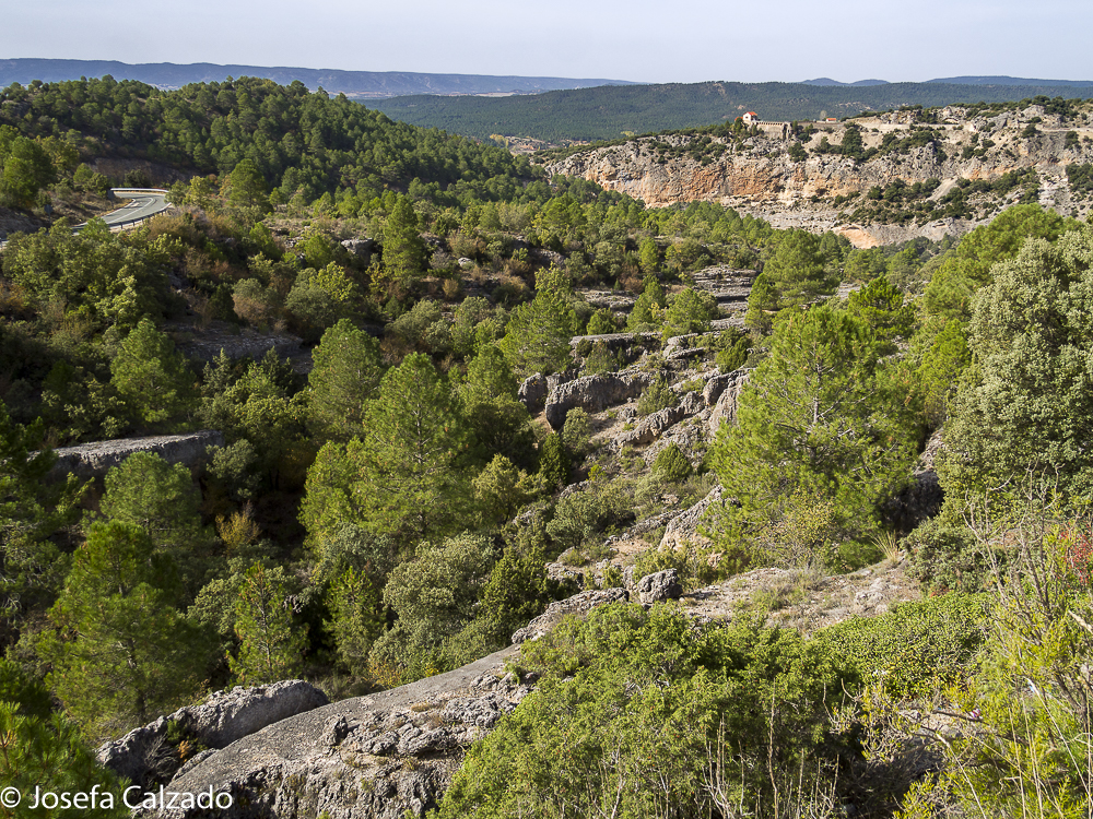 Serranía de Cuenca, detalle de los cortados y al fondo el pueblo el Salto de Villalba