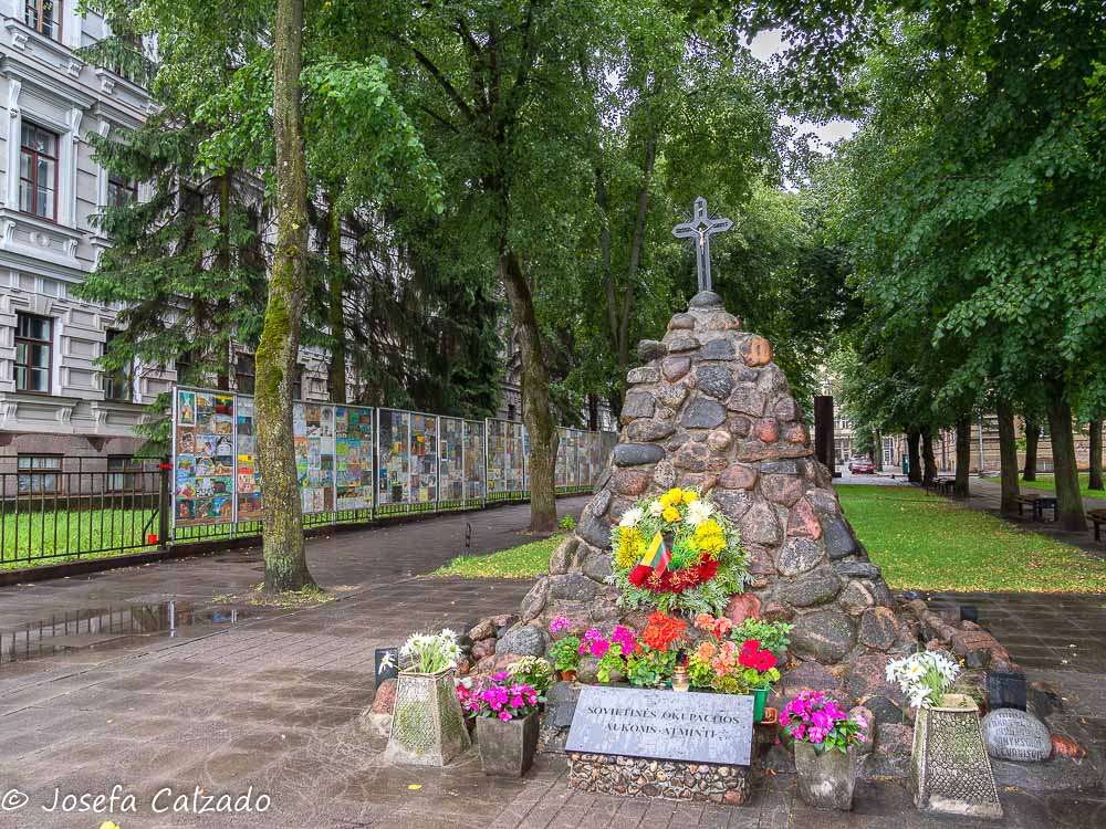 En primer plano monumento a los caídos en la ocupación soviética