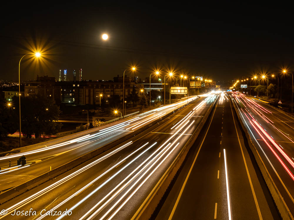 Estelas en la noche y como fondo la luna llena sobre Madrid y las 4 Torres al fondo