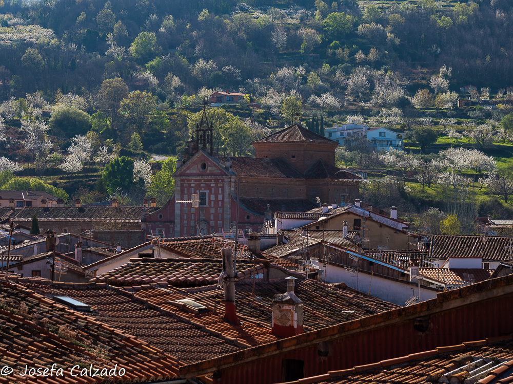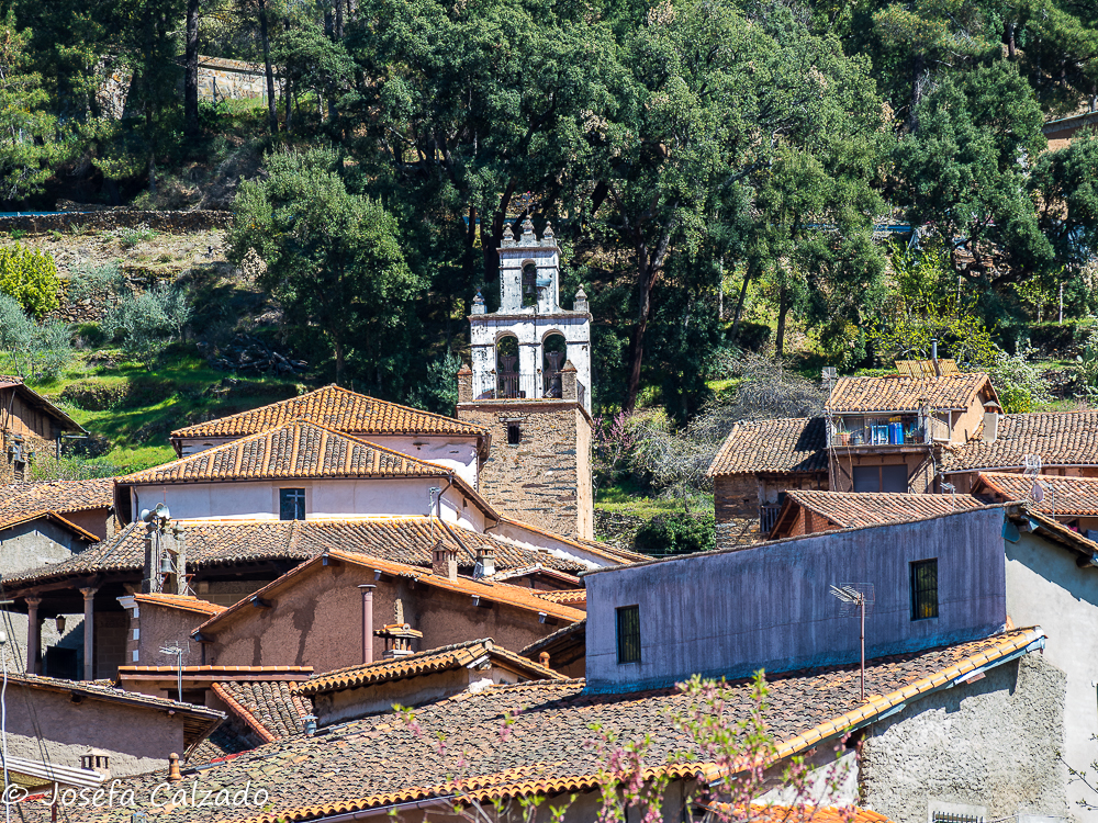 Siguiendo con el viaje, nos acercamos a Robledillo de Gata, primer pueblo de la Sierra de Gata, una verdadera joya de la arquitectura popular serrana y extremeña, que mantiene su trazado desde la Edad Media, lleno de callejuelas, pasadizos y corredores estrechos que se aferran al terreno con sus típicas casas de tejas rojas. Para rematar el conjunto, a la vera del río Árrago, se extienden sus huertos de frutales. Se llega a través de una sinuosa carretera que deja el pueblo semi oculto en el fondo del valle, lo que le ha permitido preservar su peculiar arquitectura popular de pizarra, madera y barro por lo que ha sido declarado conjunto histórico. Además, en la parte alta de la localidad se encuentra la iglesia de Nuestra Señora de la Asunción (siglo XVI), de original planta hexagonal y pórtico singular de columnas con inscripciones bíblicas. Según nos indicaron, se levantó sobre un antiguo palacio de la familia Alba y pasó a manos de la marquesa de Monroy antes de ser finalmente destinado a iglesia.