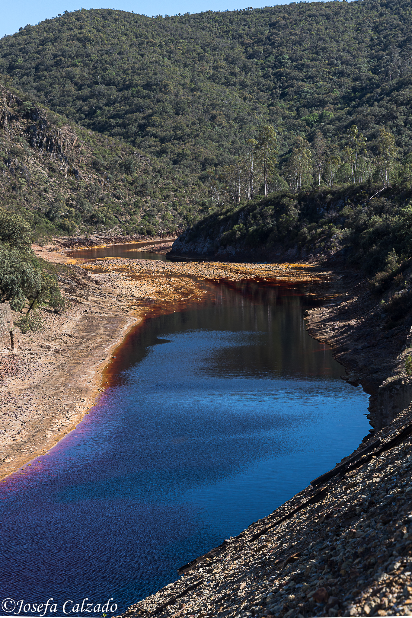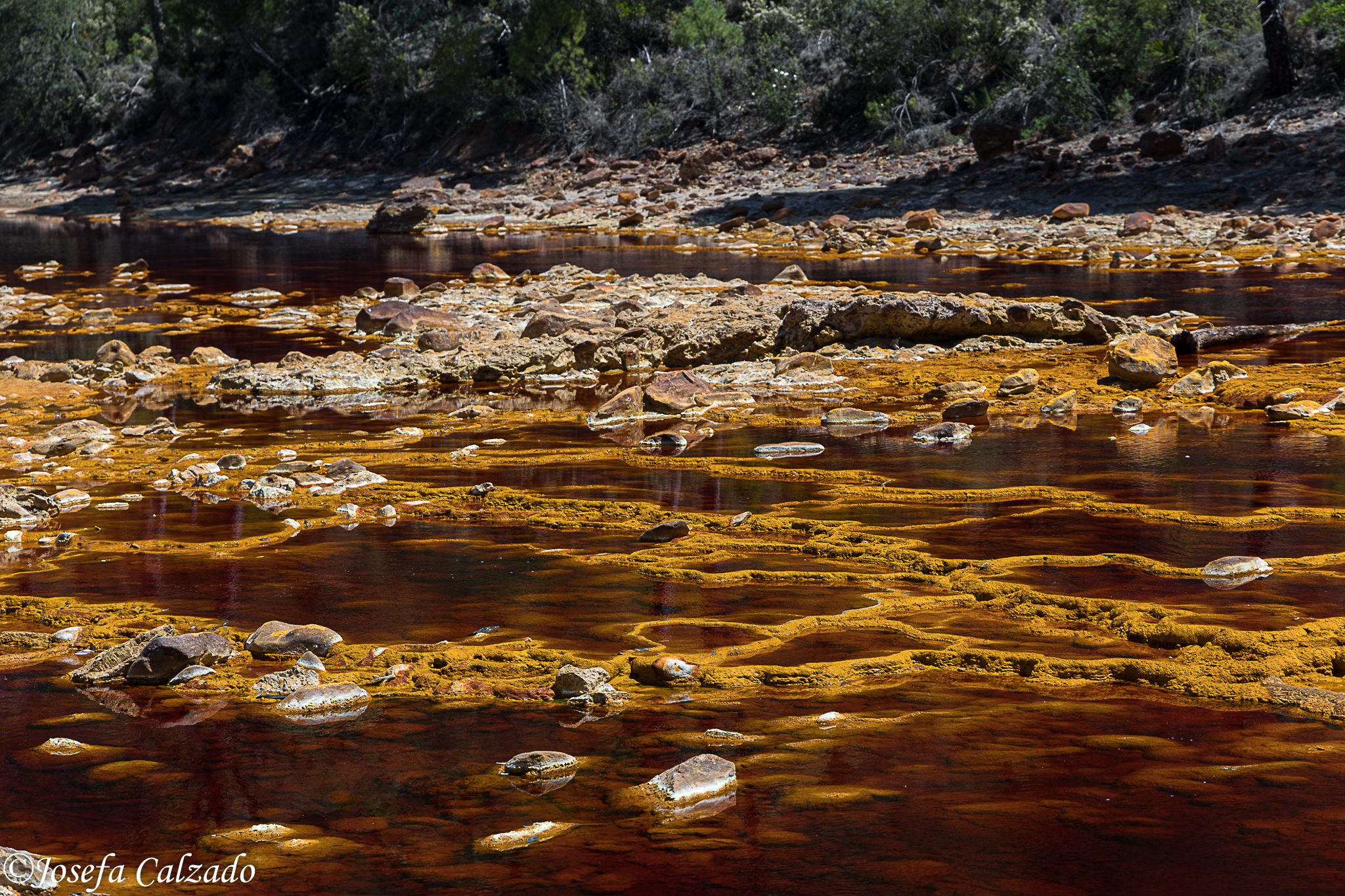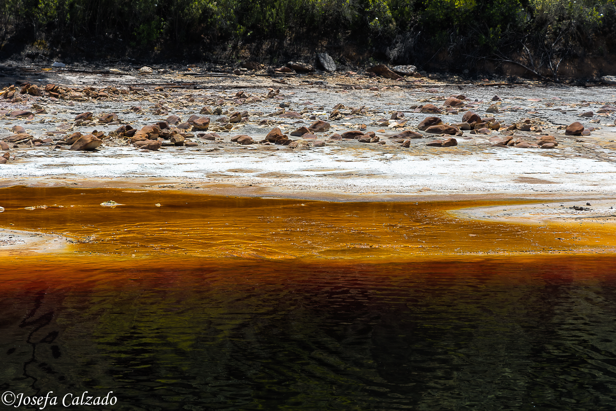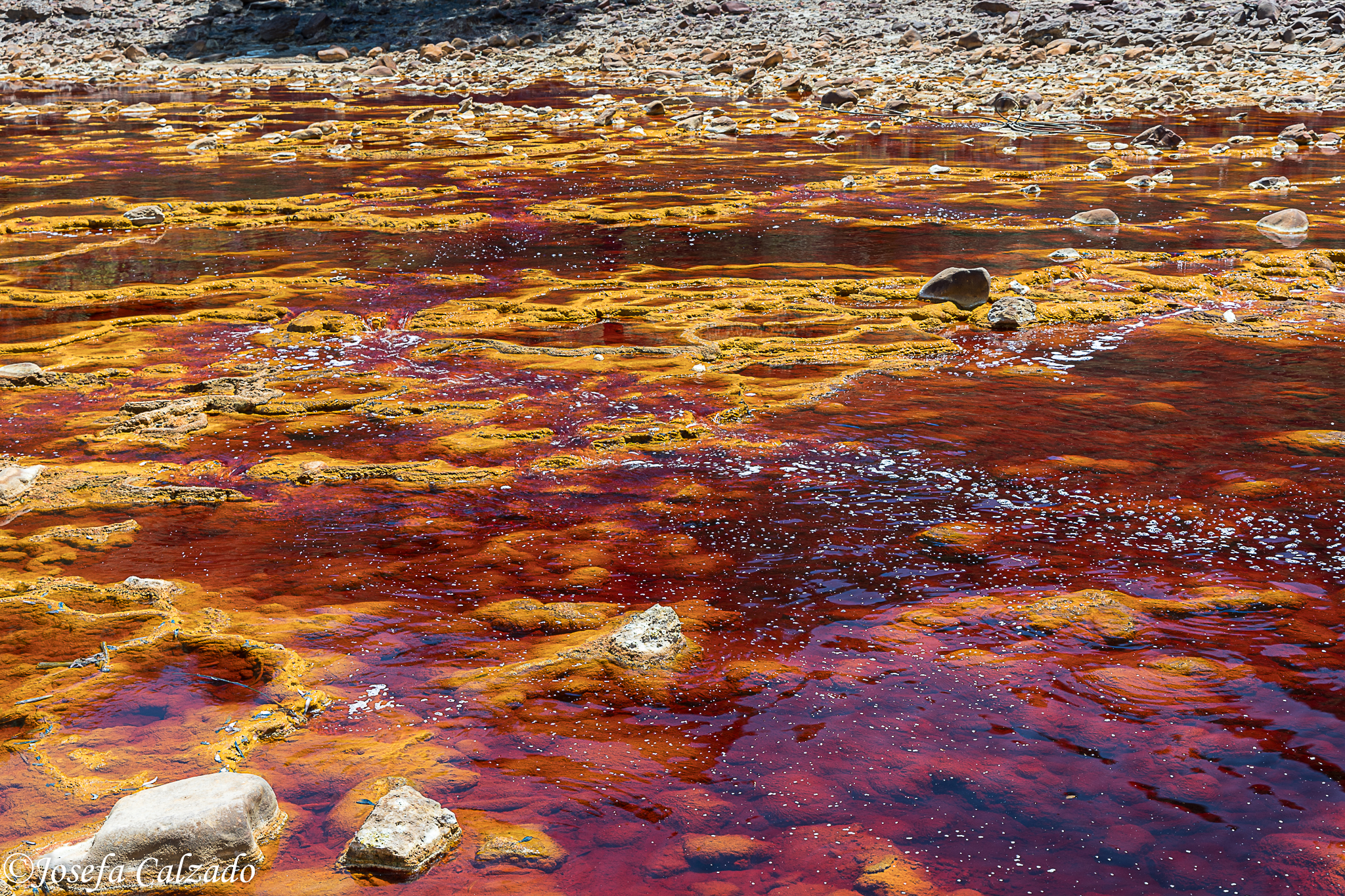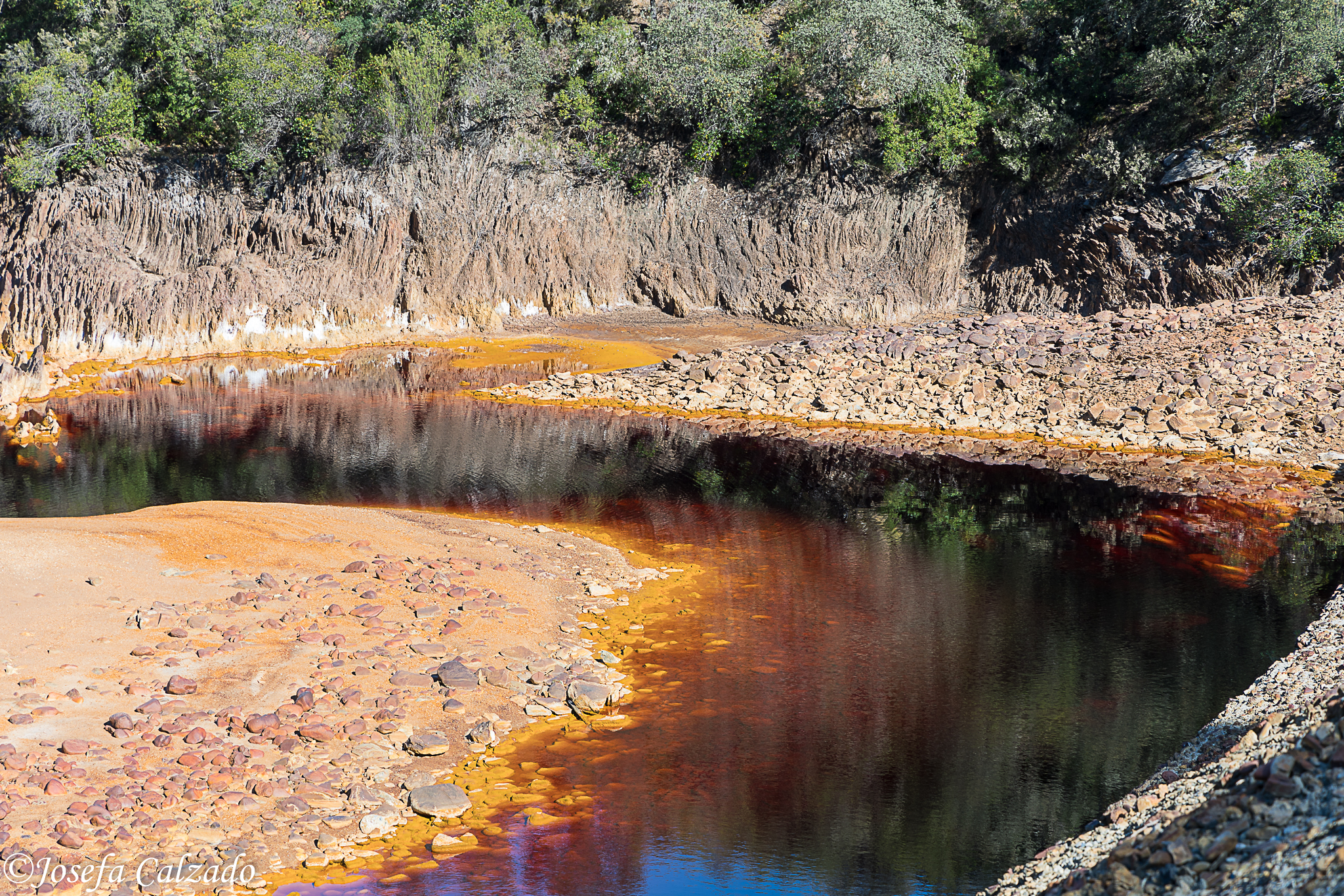 El nombre del río proviene de su color rojizo, que pasa a ocre en las orillas. Estas tonalidades se deben al alto contenido en sales ferruginosas y sulfato férrico que, junto a la escasez de oxígeno, le otorgan un pH muy ácido. En las orillas se presentan estructuras características, resultado del enfriamiento de la escoria y los residuos mineros.