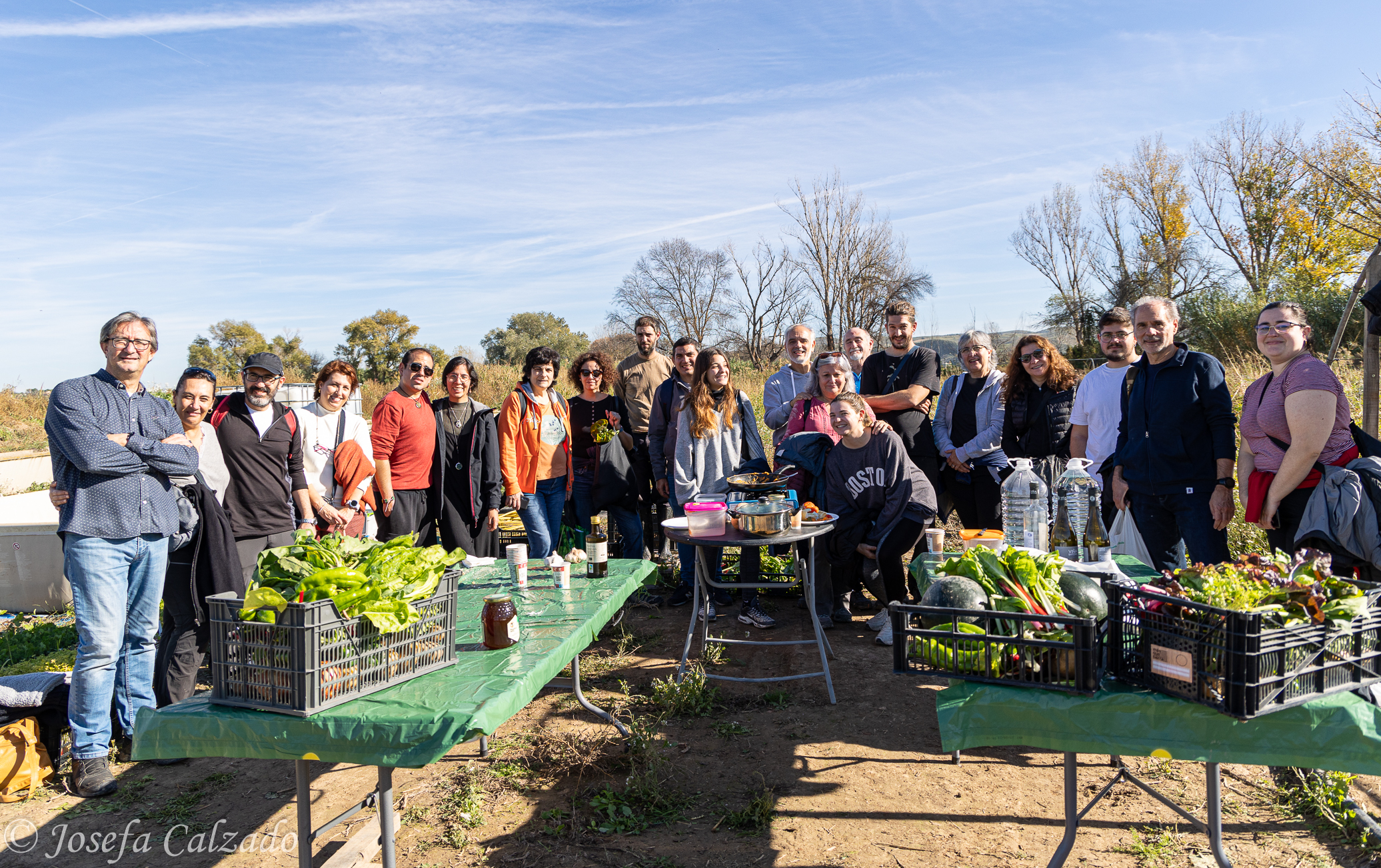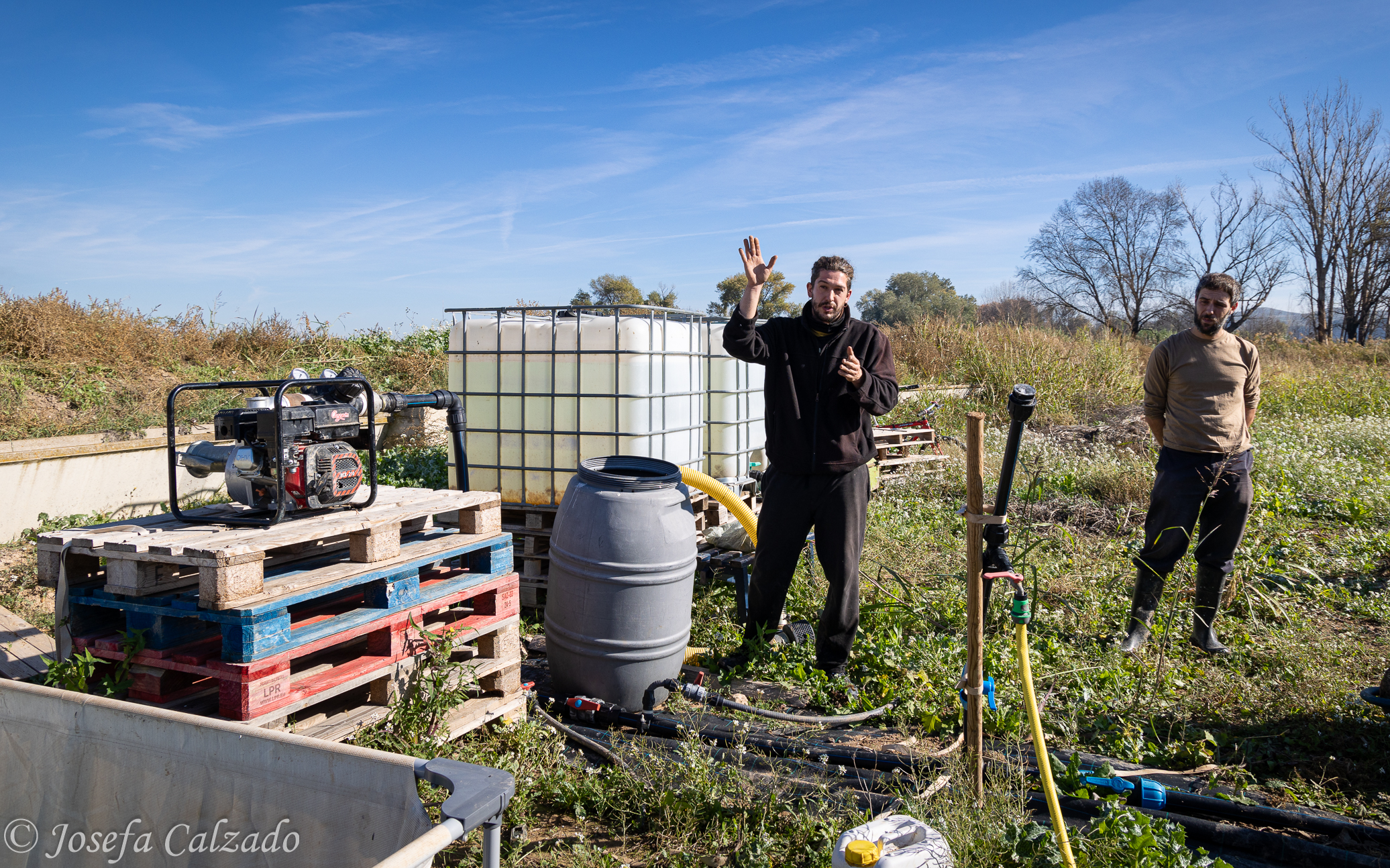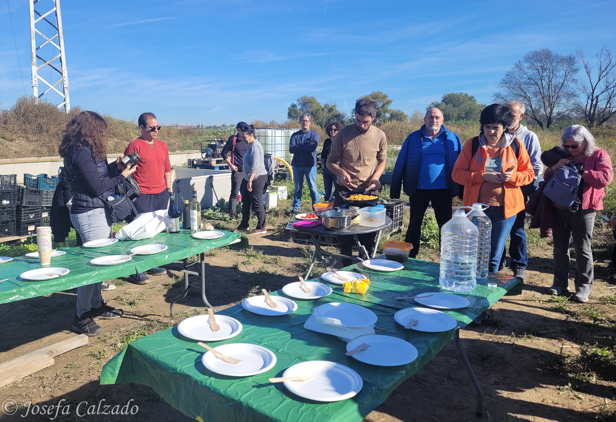Más que tierra son, según se describen ellos mismos, «Dos jóvenes agricultores e ingenieros, Sergio y Jorge, con experiencia en la producción ecológica de hortalizas, el compostaje y la educación ambiental. Concienciados con la economía circular y con una manera diferente de producir». Yo los definiría además como dos personas concienciadas con el planeta que nos dan la oportunidad de disfrutar del producto de su trabajo. Un trabajo muy duro realizado sin usar pesticidas ni abonos químicos. Ellos fabrican su propio pesticida, entre otras cosas, «destilando agua de ajo«, reducen el consumo de agua instalando riego por goteo y no por inundación, además de aprovechar la tierra haciendo asociaciones de cultivo sembrando juntas cebolla que crece hacia abajo y coliflor que crece hacia arriba ó lechuga y colinabo. Además elaboran su propio compost por medio del humus de lombriz roja, mezclándolo con el agua de goteo con el que riegan y enriqueciendo el suelo de la huerta. En fin, toda una experiencia la que disfrutamos y en la que al final pudimos degustar unas deliciosas patatas peluchonas o revolconas con pimientos, pan del pueblo, aceite y vino de la propia cosecha de las bodegas del pueblo.