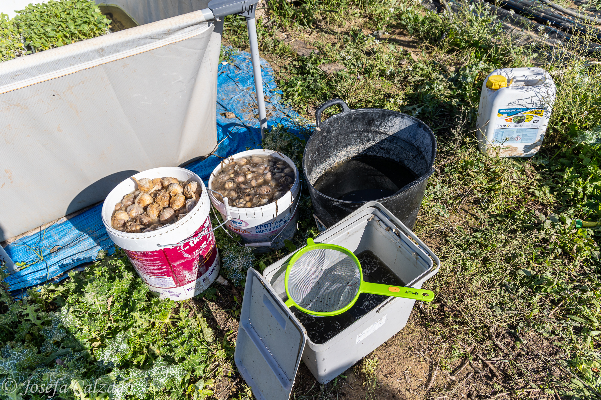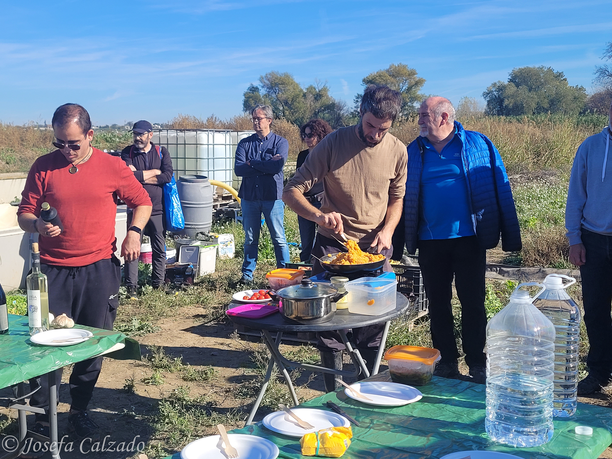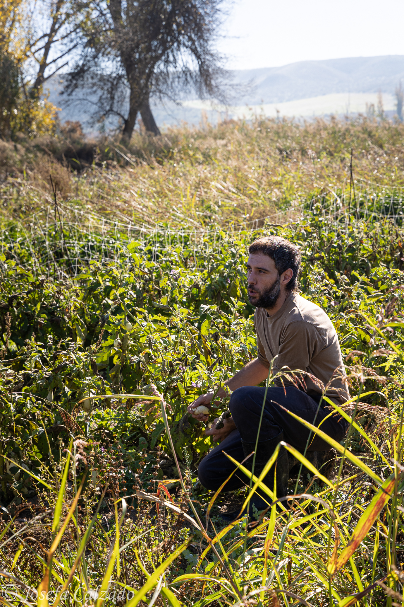 Más que tierra son, según se describen ellos mismos, «Dos jóvenes agricultores e ingenieros, Sergio y Jorge, con experiencia en la producción ecológica de hortalizas, el compostaje y la educación ambiental. Concienciados con la economía circular y con una manera diferente de producir». Yo los definiría además como dos personas concienciadas con el planeta que nos dan la oportunidad de disfrutar del producto de su trabajo. Un trabajo muy duro realizado sin usar pesticidas ni abonos químicos. Ellos fabrican su propio pesticida, entre otras cosas, «destilando agua de ajo«, reducen el consumo de agua instalando riego por goteo y no por inundación, además de aprovechar la tierra haciendo asociaciones de cultivo sembrando juntas cebolla que crece hacia abajo y coliflor que crece hacia arriba ó lechuga y colinabo. Además elaboran su propio compost por medio del humus de lombriz roja, mezclándolo con el agua de goteo con el que riegan y enriqueciendo el suelo de la huerta. En fin, toda una experiencia la que disfrutamos y en la que al final pudimos degustar unas deliciosas patatas peluchonas o revolconas con pimientos, pan del pueblo, aceite y vino de la propia cosecha de las bodegas del pueblo.